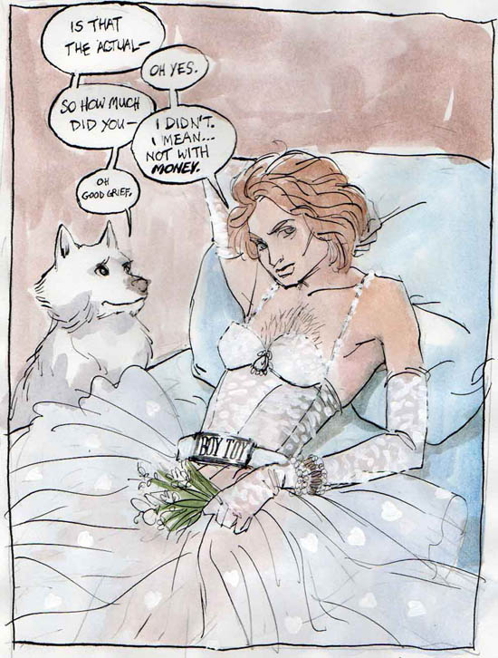 Shaenon: What can I say? People dig Unity. This sweet watercolor is by Rod Anderson. Rod writes, “I also did a one-panel thing with Tip and Sweetheart; it didn’t turn out like I intended in a number ways, but I think it’s kind of funny, and I did spend some time on it so what the heck.”