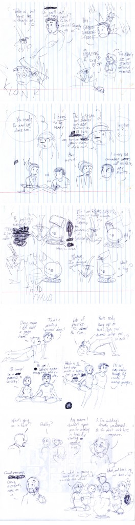 Shaenon: In the interests of sharing every step of a random page from the bonus story in Skin Horse 5, here’s the initial thumbnail. I tweaked a bunch of dialogue between this and the final, as I tend to do with[…]↓ Read the rest of this entry…