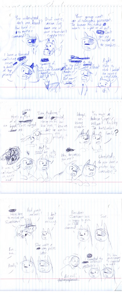 Shaenon: Biomass Unity was my favorite thing to draw in this storyline. My least favorite: Washington, D.C. landmarks filled with wild animals. Channing: I don’t always care this much about my own jokes, but I still think erotic fanfic starring[…]↓ Read the rest of this entry…