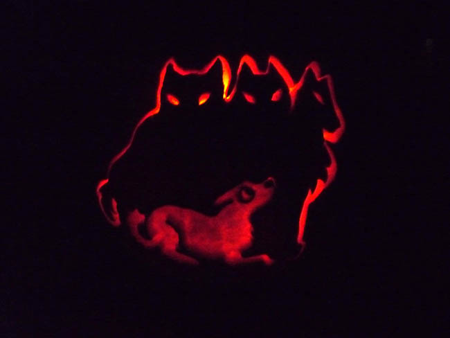 Shaenon: Look at this! Artie Guffey sent us photos of her “Sweetheart Being Menaced by Big Mean Werewolves” Jack O’Lantern. Impressive, no? But wait until you see it lit up…